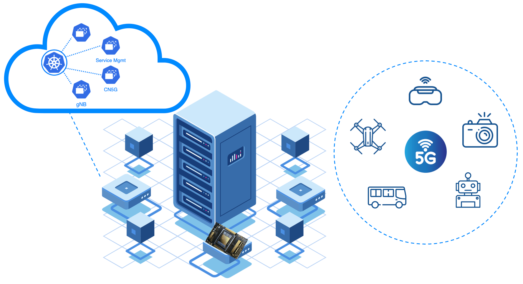Each SkyWave system includes an NVIDIA A100X converged accelerator to host the 5G ARC-OTA physical layer. The NVIDIA A100X combines the capabilities of NVIDIA A100 Tensor Core GPU with the BlueField-2 DPU. With MIG, each A100 can be partitioned into as many as seven GPU instances, allowing even more services to run simultaneously. This card can be used to experiment with the 5G signal processing pipeline and to also provide acceleration for Machine-Learning models and other research needs, when not operational as a private 5G network or leveraging MIG capabilities.