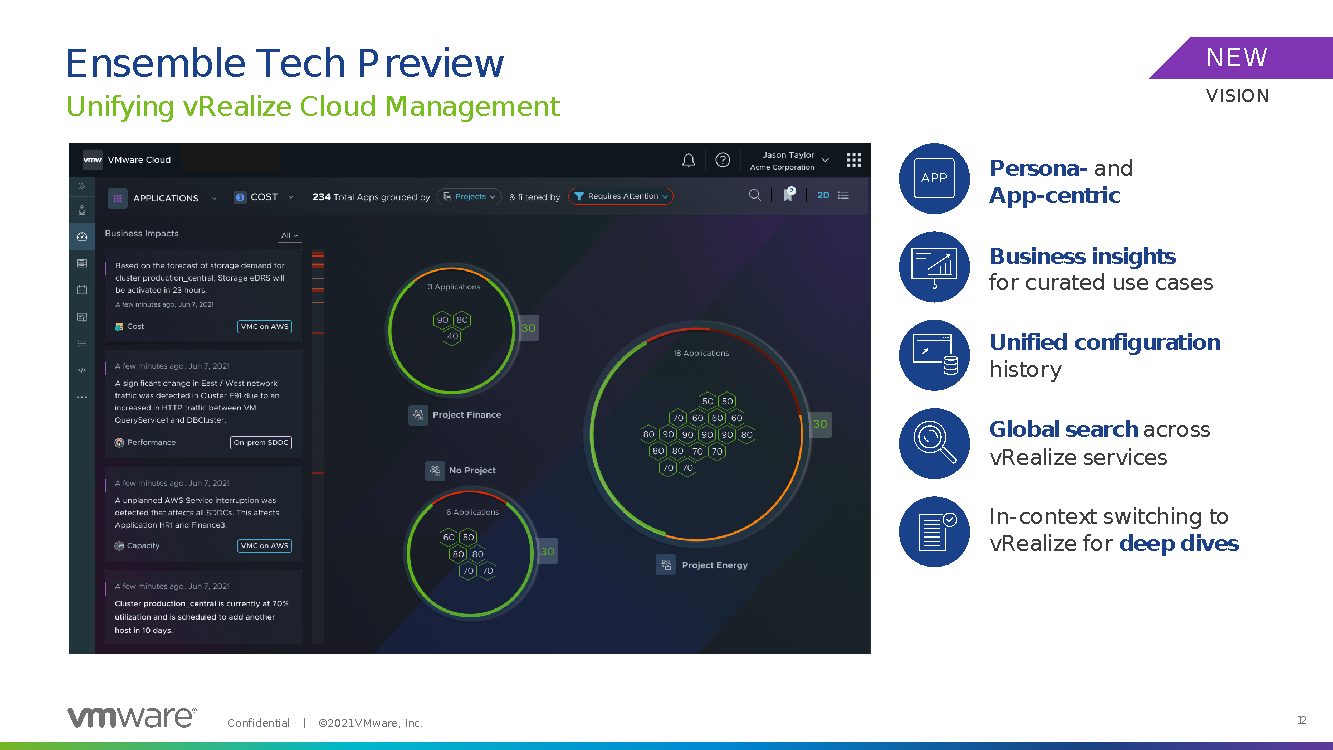 Ensemble also uses machine learning to understand what is happening in the environment and create views that will help customers better understand their environments. The focus is on the application, which will help customers with the business, generating solutions they manage. This is interesting, as the application hasn’t been the key part of monitoring for VMware — the infrastructure and hypervisor are the main focus. With this change we will be able to see the application criticality front and center.