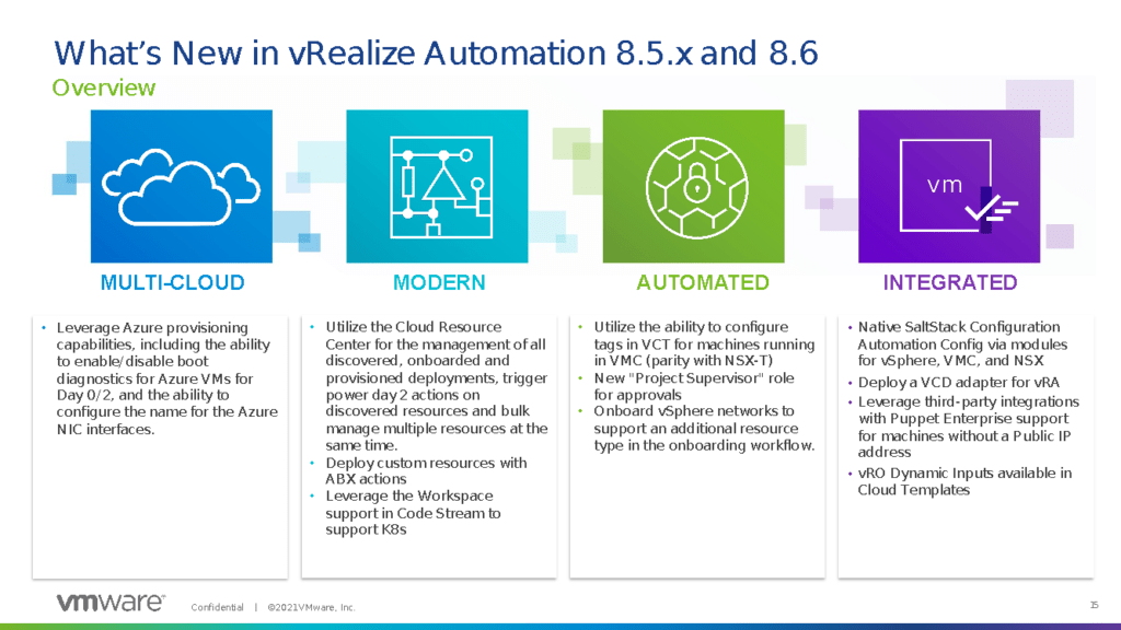 My previous blog was part one in a two-part series reviewing VMware announcements ahead of VMworld 2021. In that first part, I focused solely on management. Here in part two, I look at other announcements in VMware’s product lines, and I’m focusing on automation, logging, and networking. Both blogs address the VMware vRealize Suite, which covers vRealize Automation (vRA), vRealize Operations (vROPS), vRealize Log Insight (vRLI), and vRealize Network Insight (vRNI). Today we’re going to investigate VMWare’s announcements around vRA, vRLI, and vRNI, and the different components that will be added, upgraded and configured for better use-cases.