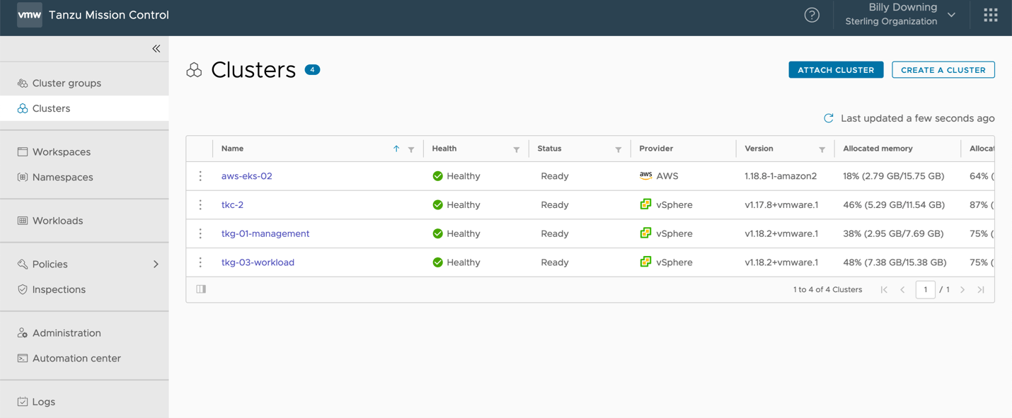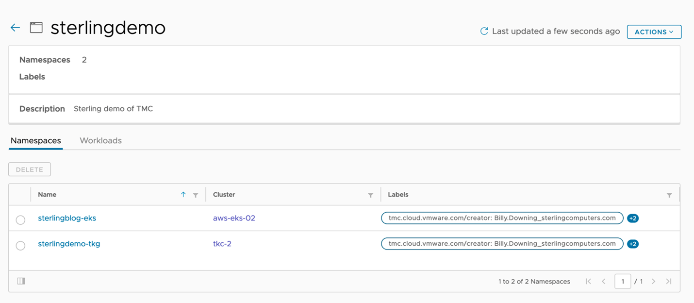 Using TMC, we can actually create the namespaces we’d like to then group. In this scenario, we’ve created two namespaces one for each cluster for which to allocate access to for a specific set of developers. Sterlingblog-eks for the EKS cluster, and sterlingdemo-tkg for the vSphere with Tanzu cluster. Now that we have managed namespaces, much like how we attached clusters to the instance and grouped them, our next move is to group these namespaces (across multiple clusters) into a single workspace, as shown in Figure 4 with the sterlingdemo workspace.