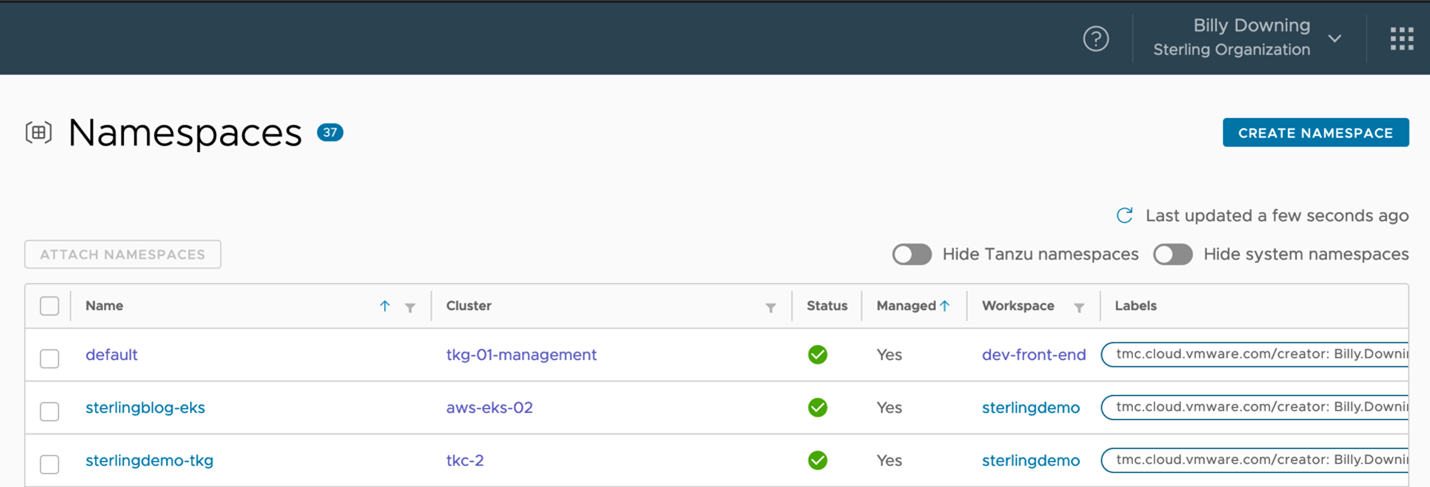 Figure 3: Namespaces that are managed by Tanzu Mission Control
