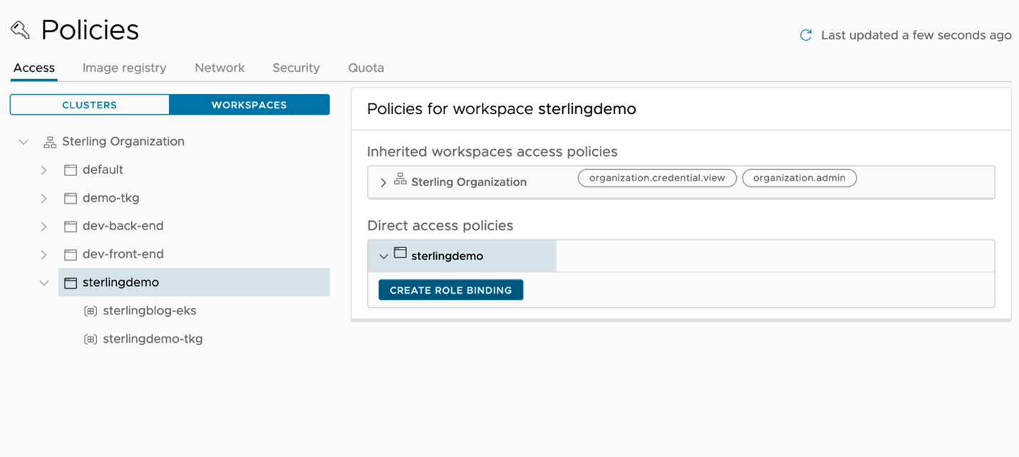 Finally, we have our clusters attached, provisioned, and grouped for the operations teams, and our namespaces allocated and grouped for our application teams. We’ll now take a look at the policy engine within TMC to secure our clusters and applications with conformity without having to individually apply anything to a single cluster. Figure 5 reviews some of the policy types we can create and allows us to apply them to either a cluster group or workspace. For example, in Figure 5 we’ve created an access policy to determine who can access our sterlingdemo workspace. Since the workspace contains two namespaces the policy will be applied in all relevant clusters.