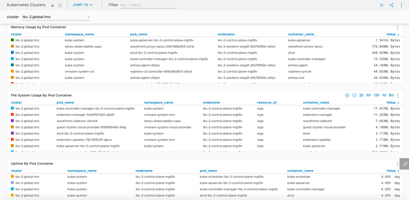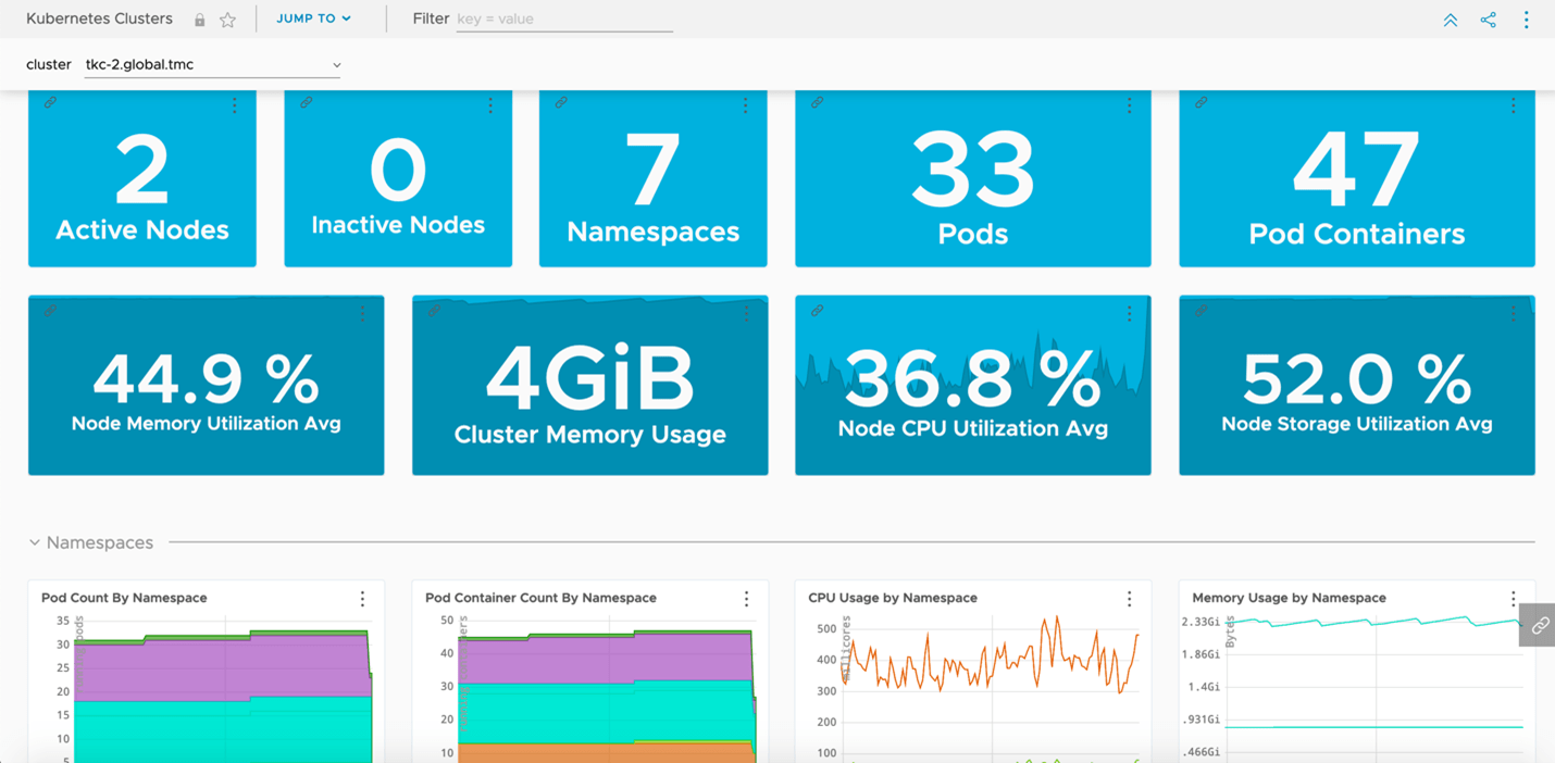 TMC also provides a direct integration into Tanzu Observability by Wavefront which provides us the capability to automatically deploy the agents required to export all our deep granular metrics from our clusters. These metrics provide more than just general health checks, but also an insight into application behaviors, network capacity, storage usages, and so forth as shown in Figures 7 and 8.