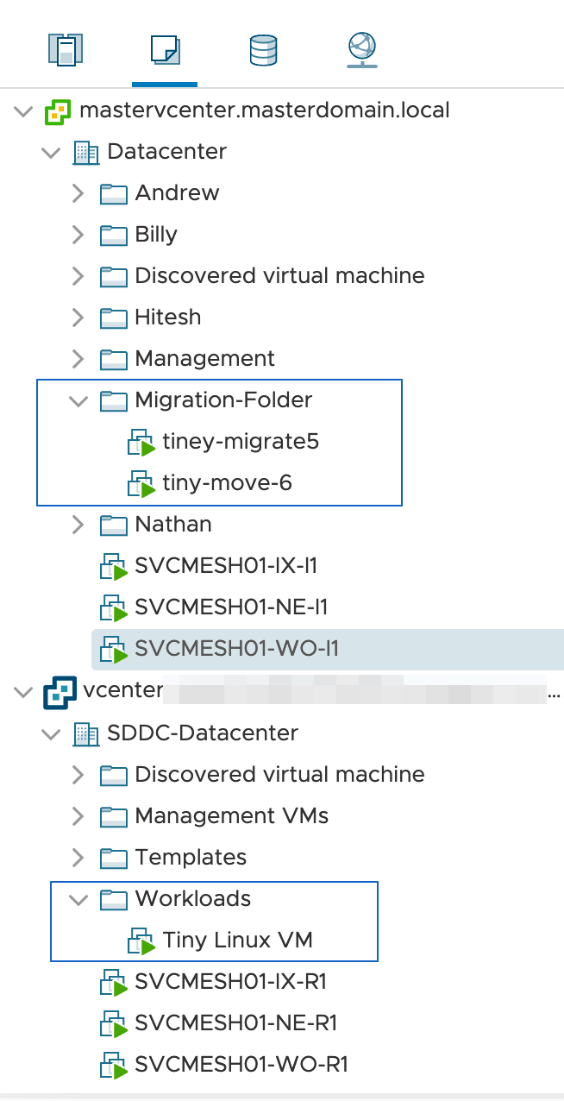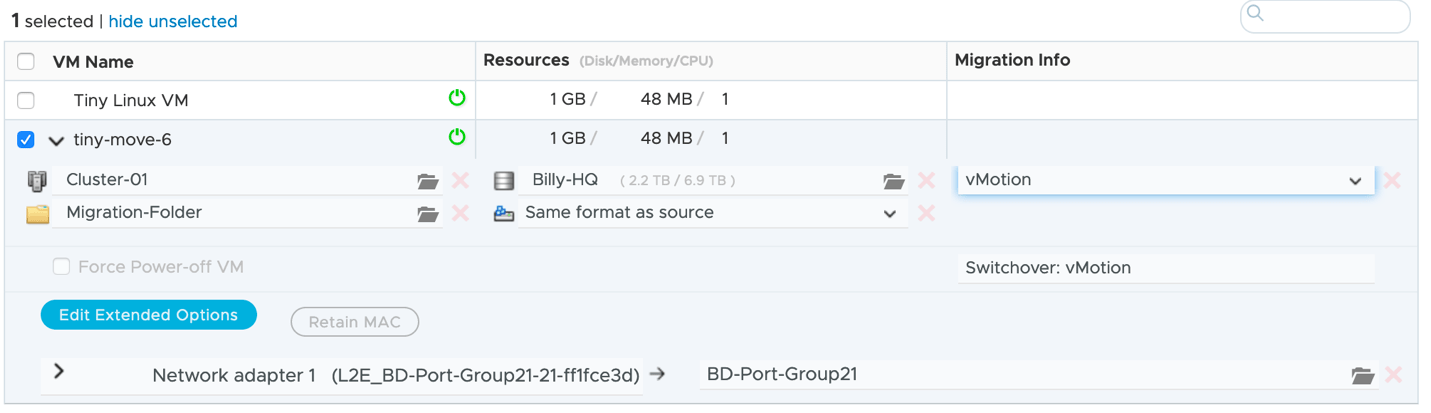 Within our HCX service mesh we can see several capabilities, however in this use-case we’ll focus on layer 2 extensions. Which in this environment two port-groups are extended from our on-prem environment, BD-PortGroup21 and NB-Port-Group43 (Figure 7). Our goal here is to migrate the virtual machine tiny-move-6 from our cloud environment to our on-prem environment without taking an outage using vMotion through HCX. Taking a look back at Figure 4 we can confirm the current location of tiny-move-6 in the VMC environment from our single pane of glass management across the hybrid cloud.