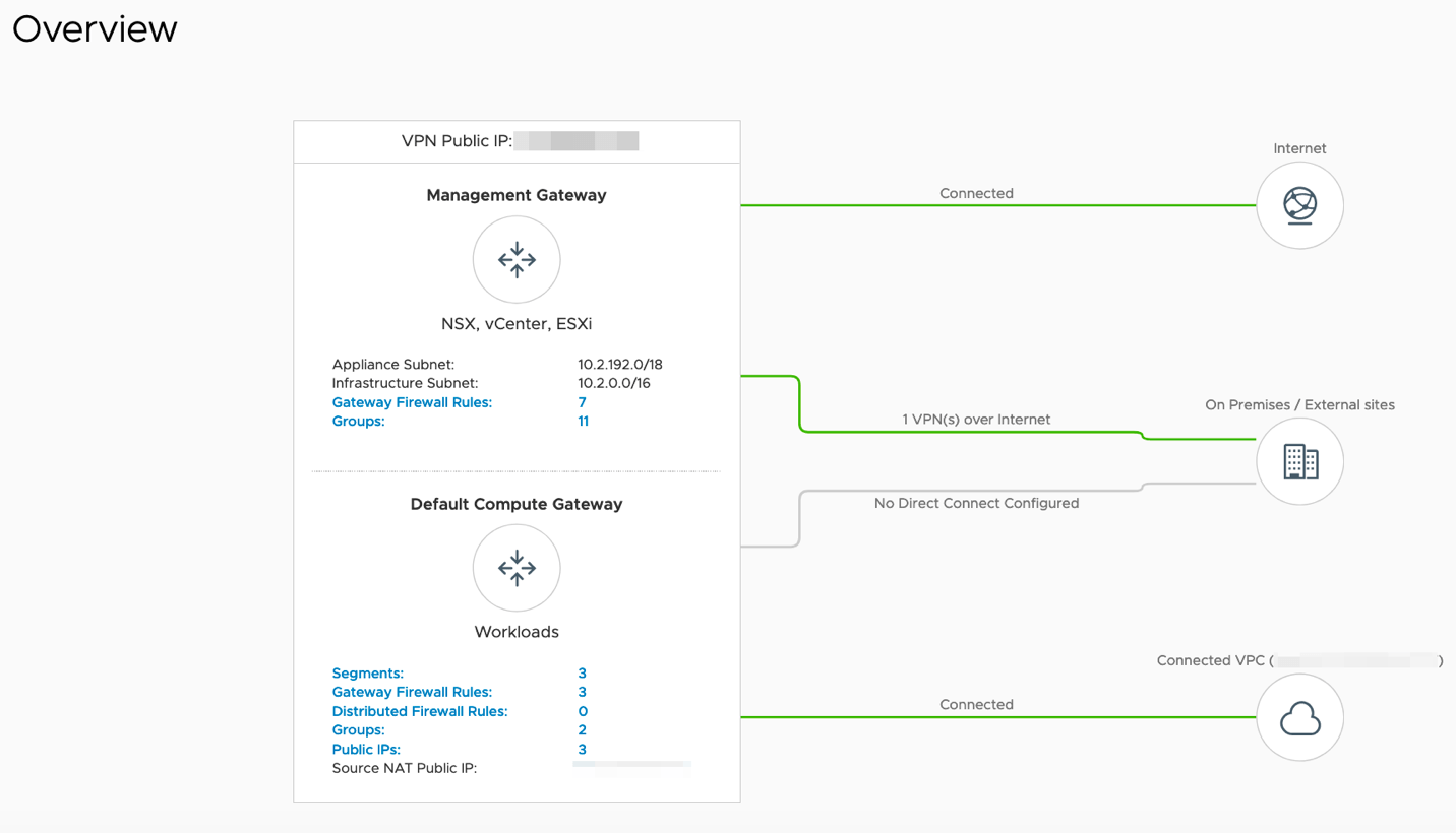 From the perspective of our VMC on AWS console the topology is reflected in Figure 2 and Figure 3, displaying our SDDC resources and network layout for internet connections and a layer 3 policy-based VPN connecting our on-prem to the cloud environment.