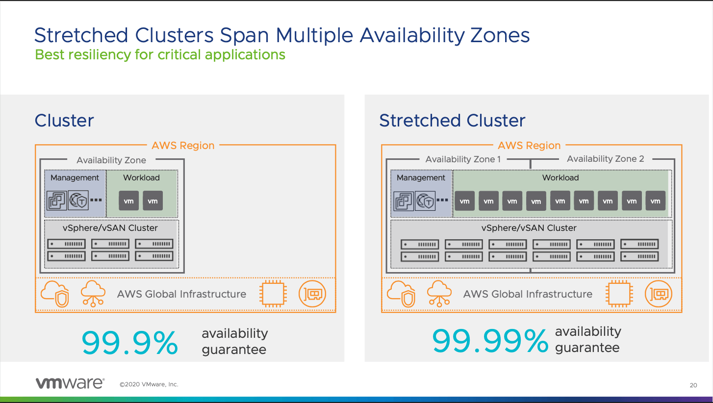 Speaking of reliability, VMC on AWS has been available as a stretched cluster for a while now, allowing you to improve your 99.9% uptime to 99.99%, which may give you the extra edge you’re seeking for compliances and policies. Stretched clusters also has been reduced in terms of sizing, allowing a simple 2-2-1 host solution, or, in other words, two hosts in two zones with one witness node.
