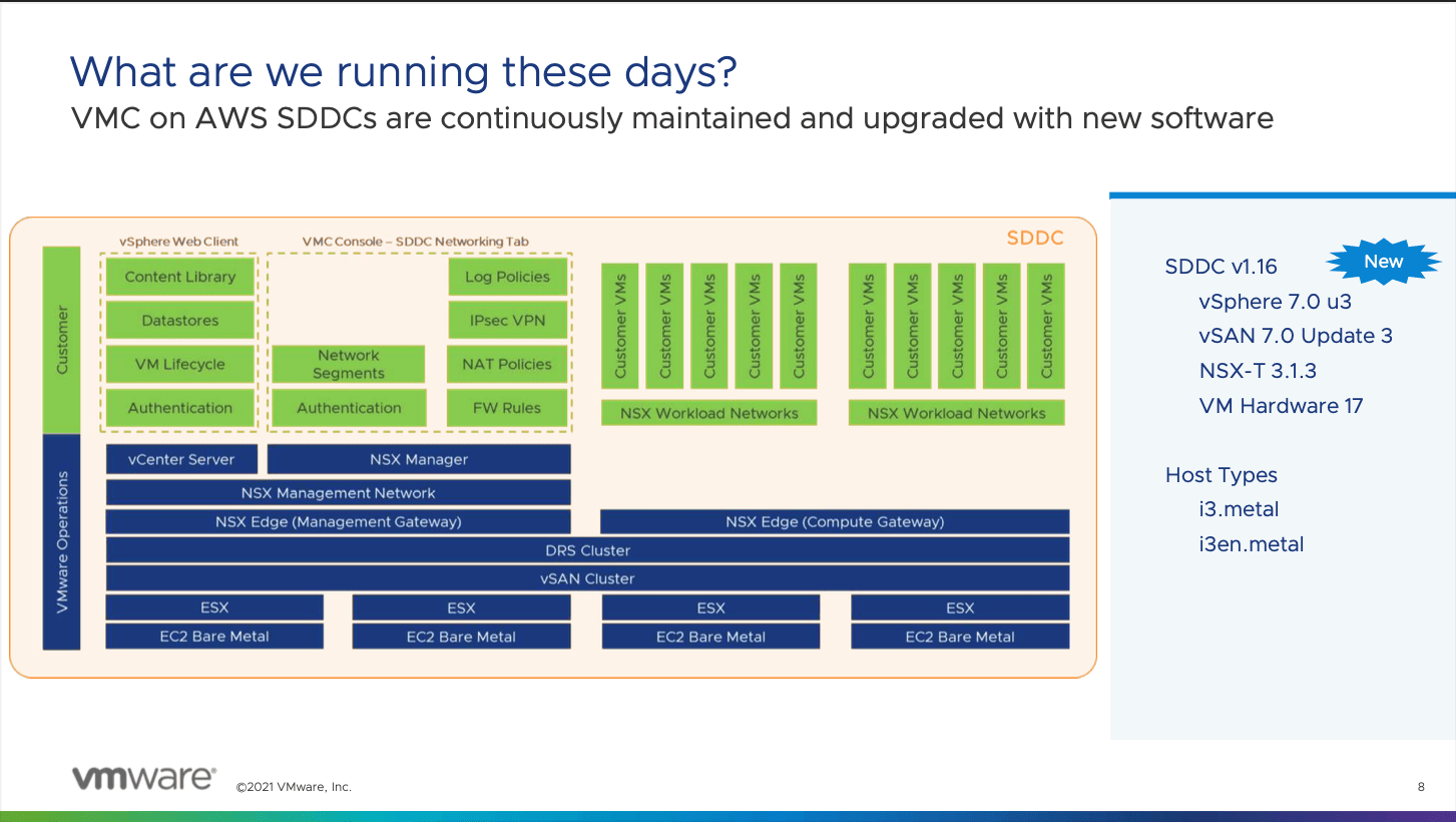 Finally, on the VMC itself: A huge upgrade is being made to the SDDC. VMC on AWS is being updated from 6.7 U3 to 7.0 U3, allowing the new updates that VMware is bringing in 7.0U3 to all your VMC on AWS cluster. I was wondering when this would happen, as it seemed strange that some SDDC clusters within the big cloud partners were still around 6.7U3 or earlier. Now, when you jump into VMC on AWS, you will have the ability to enjoy all the capabilities of 7.0U3 after the cluster is prepped and ready to be consumed.