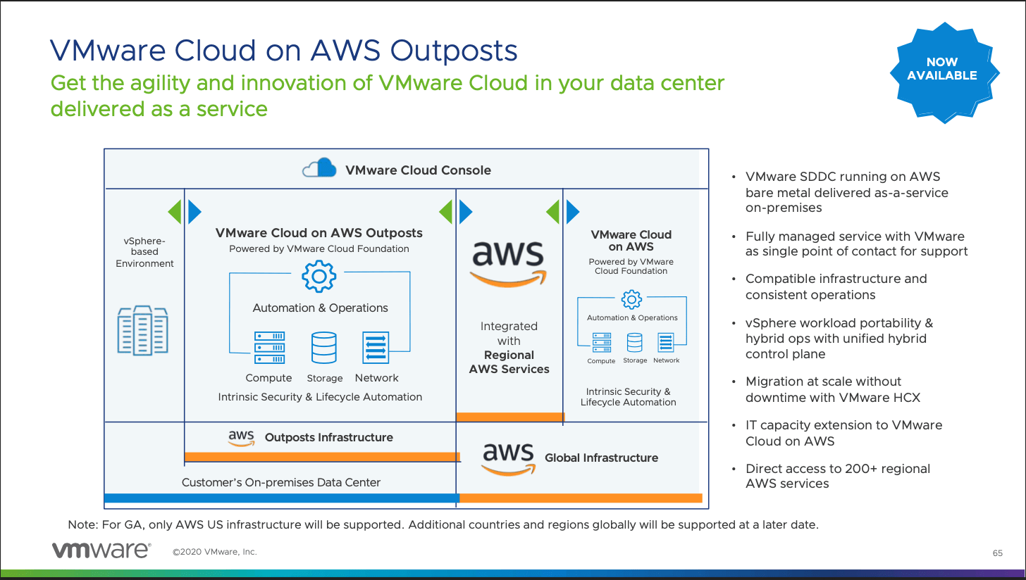 AWS Outpost is a new compute-and-storage solution utilizing VMC on AWS. Customers purchase a rack of servers that are configured via AWS, then stacked or racked in an on-premises data center. Outpost is connected to an AWS region and maintained by the data center yet still retains support from AWS. Not only do you get the rack of servers with connections to AWS but you get the SDDC software with vSphere, vSAN, NSX-T, and Tanzu on the same solution.
