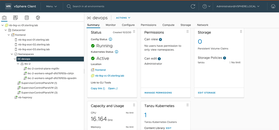 How does this appear in the vSphere User Interface (UI)? Figure 1 displays the environment with the Tanzu Kubernetes service enabled, a namespace called ‘DevOps,’ which houses a three-node Tanzu Kubernetes Cluster deployed through a typical Kubernetes manifest, using custom resource definitions. Towards the bottom of the right inventory pane, there is also the HAProxy (nb-Haproxy) virtual machine (VM) deployed to front-end the Kubernetes API for the clusters deployed, which has been replaced as the default load balancer by the NSX advanced Load Balancer in later version of vSphere with Tanzu.