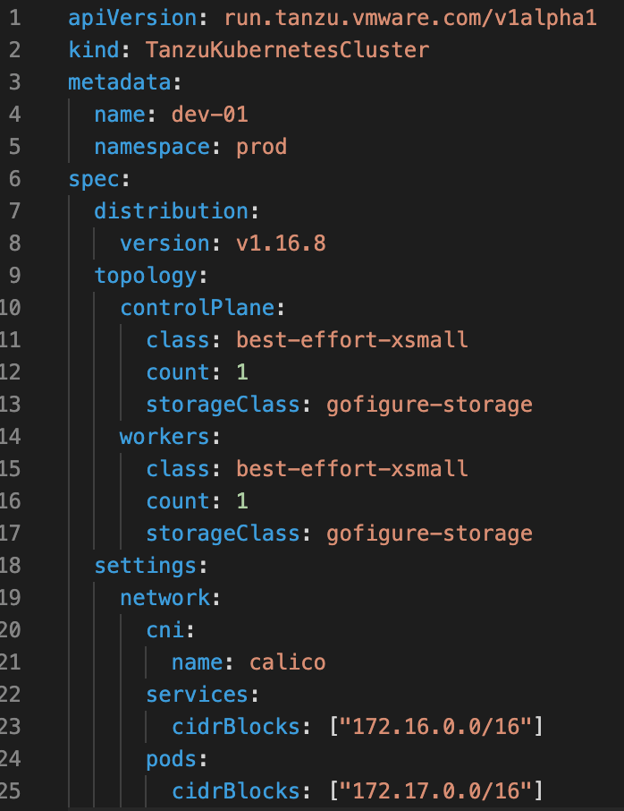 In this case, I deployed my TKG cluster using the already established Supervisor cluster as the ClusterAPI endpoint with a simple K8’s manifest (Figure 2). I then, applied it using the normal kubectl apply syntax. Therefore, the TKG cluster is treated much like any other Kubernetes object would within the cluster. In terms of VMware, it is shown in the UI as an independent object (Figure 3). All within the ‘prod’ namespace.